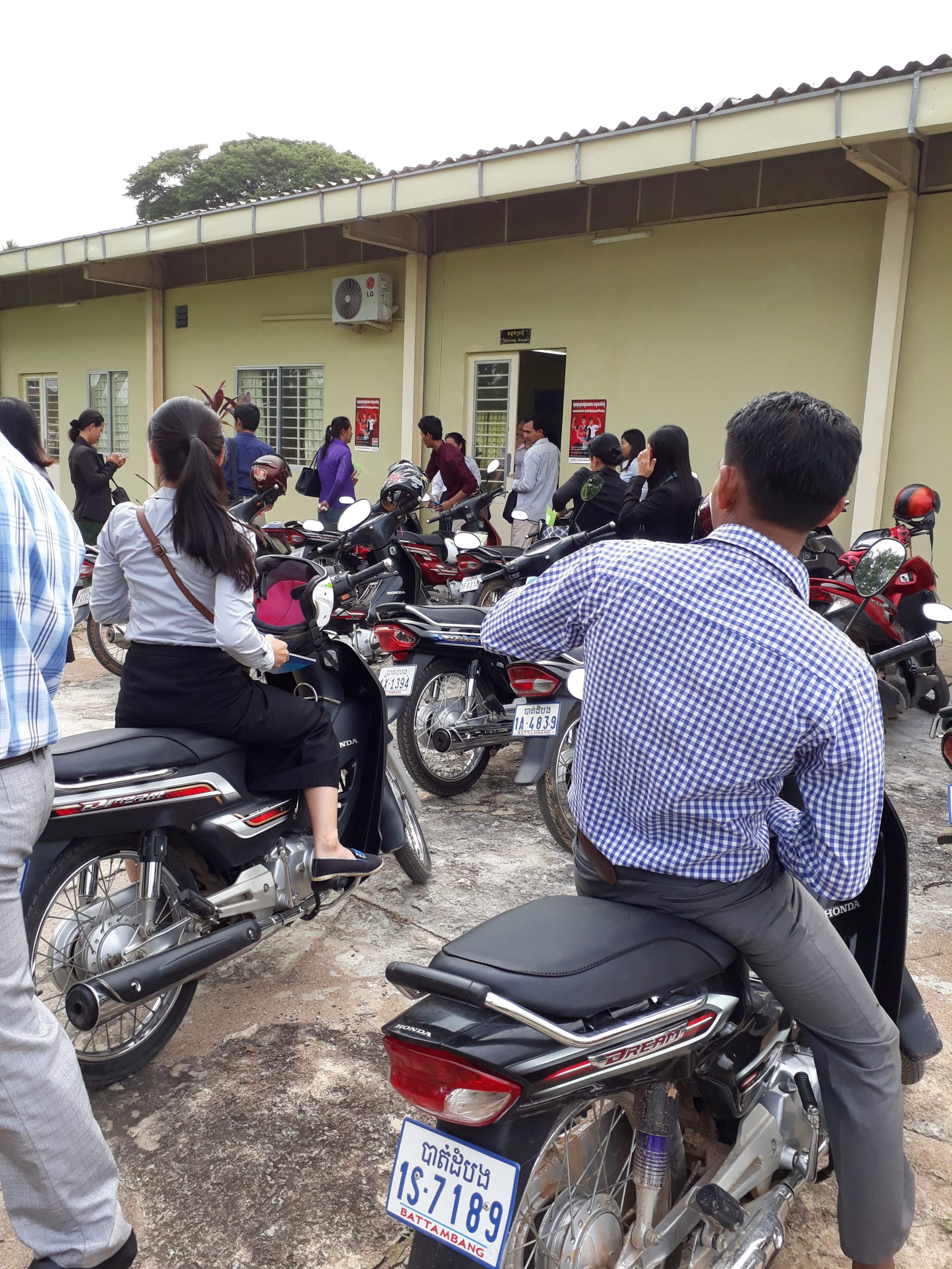 Ensimmäisen koulutuspäivän päätteeksi tutustuimme paikalliseen tekniseen kouluun. Paikasta toiseen siirtymiseen ei tarvitse järjestää yhteiskuljetusta, koska jokaisella on oma ”moto”. Niinpä ajelimme sinne porukalla. Julkista liikennettä Battambangissa ei ole. Battambang on Kambodzan toiseksi suurin kaupunki, asukasmäärästä ei ole tarkkaa lukua, arviot liikkuvat vähän alle 200 000 asukkaassa. Joten liikenne on välillä aikamoinen kaaos.