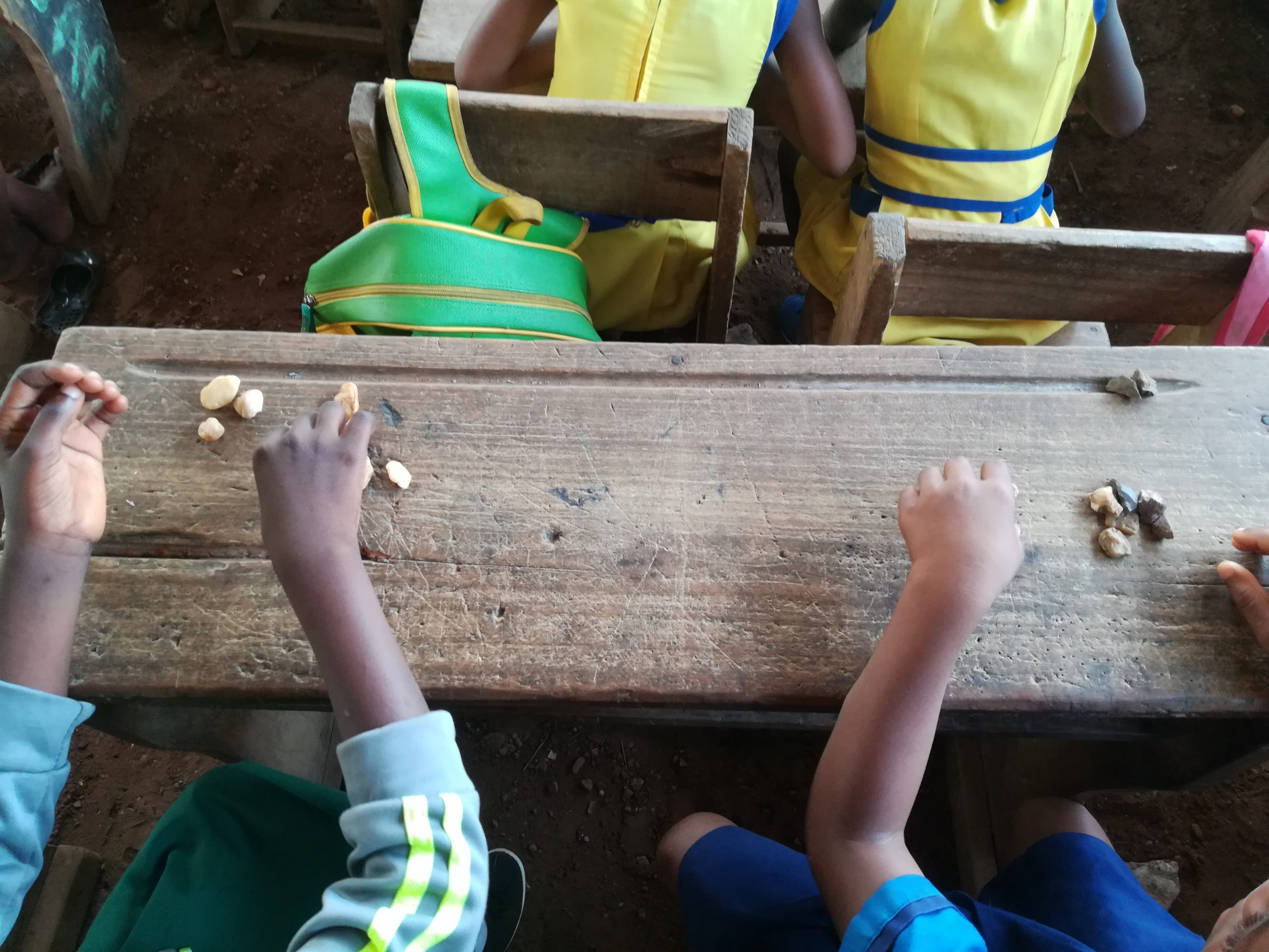 Matematiikassa opettaja hyödynsi tottuneesti kiviä yhteenlaskun harjoittelemisessa. Oppituntiin saa mukavasti liikettä, kun oppilaat kipaisevat pihalle etsimään itselleen kymmenen kiveä ja tämän jälkeen aloitetaan laskeminen. Yhdellä oppitunnilla harjoittelimme lukujonoja ja kymppipareja (tunnetaan opettajien keskuudessa myös sydänpareina) vanhasta pahvilaatikosta askarreltujen numerolappujen kanssa. Monet oppilaat, joiden olin nähnyt aikaisemmin painiskelevan vihkotehtävien kanssa, loistivat ongelmanratkaisutehtävissä, kun lukujono täytyikin yllättäen kääntää ”väärinpäin” suuremmasta pienempään lukuun! Kun tunnin aiheena olivat järjestysluvut, pidimme juoksukilpailut ulkona ja selvitimme, kuka tuli ensimmäiseksi, kuka toiseksi ja niin edelleen.